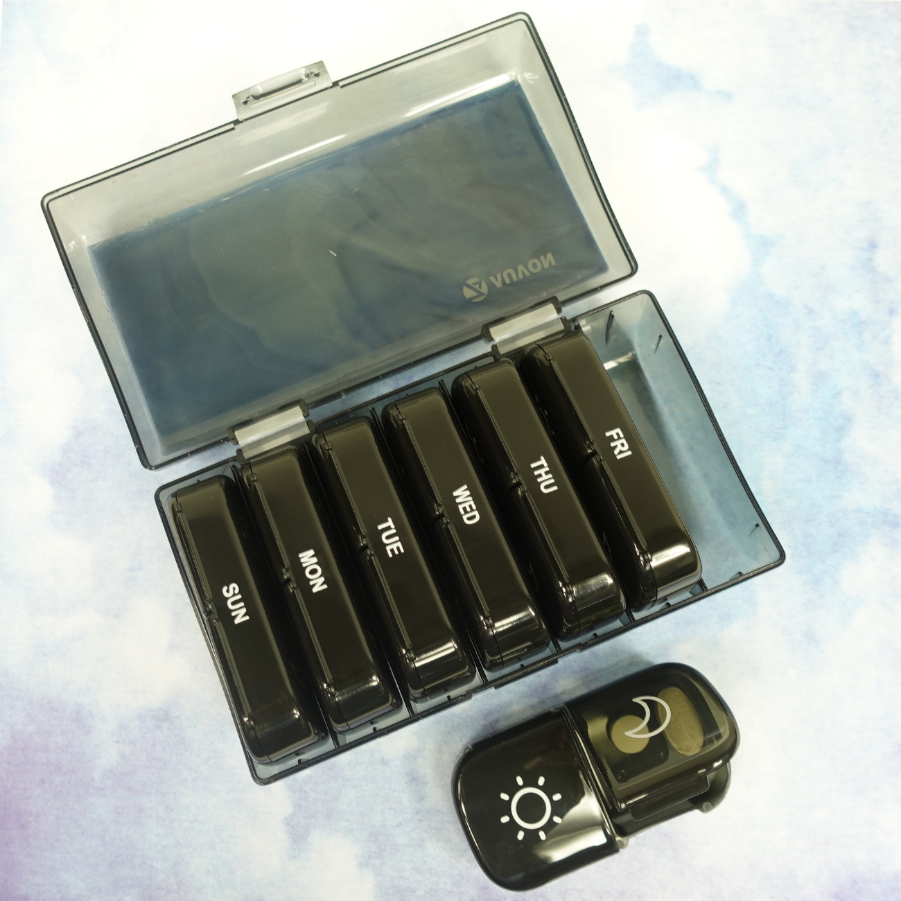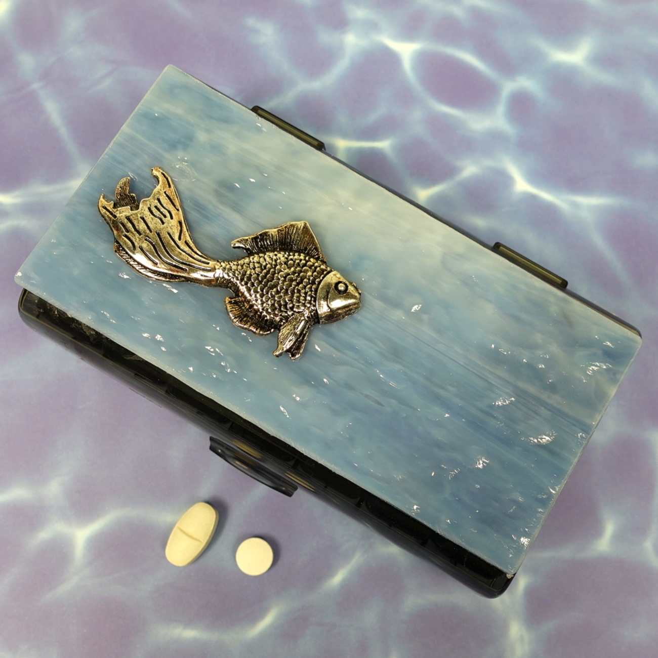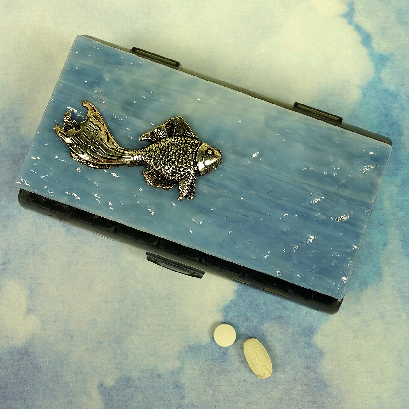 A pewter angel fish swims gracefully on the wavy blue stained glass top of this 14-dose (weekly 2X daily) black pill pod box. Open the box’s hinged lid to access its seven individual pill pods, each labeled with the day of the week. Each pod has two separate hinged compartments with sun and moon lid graphics to designate morning and evening doses. You also could use this pill organizer for two weeks’ 1X-daily doses.