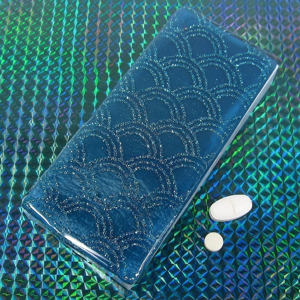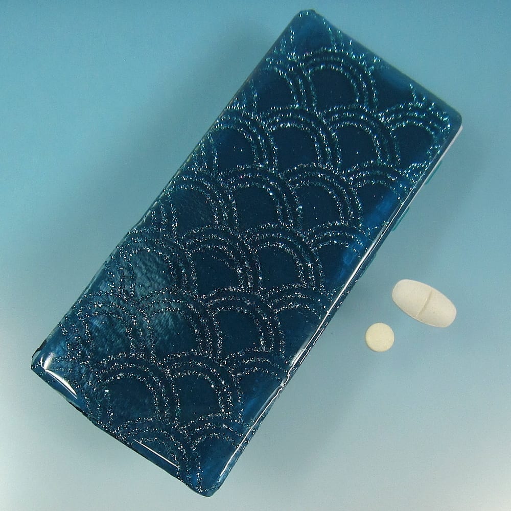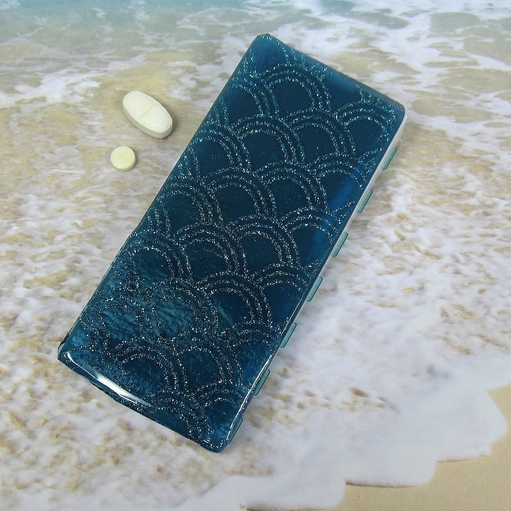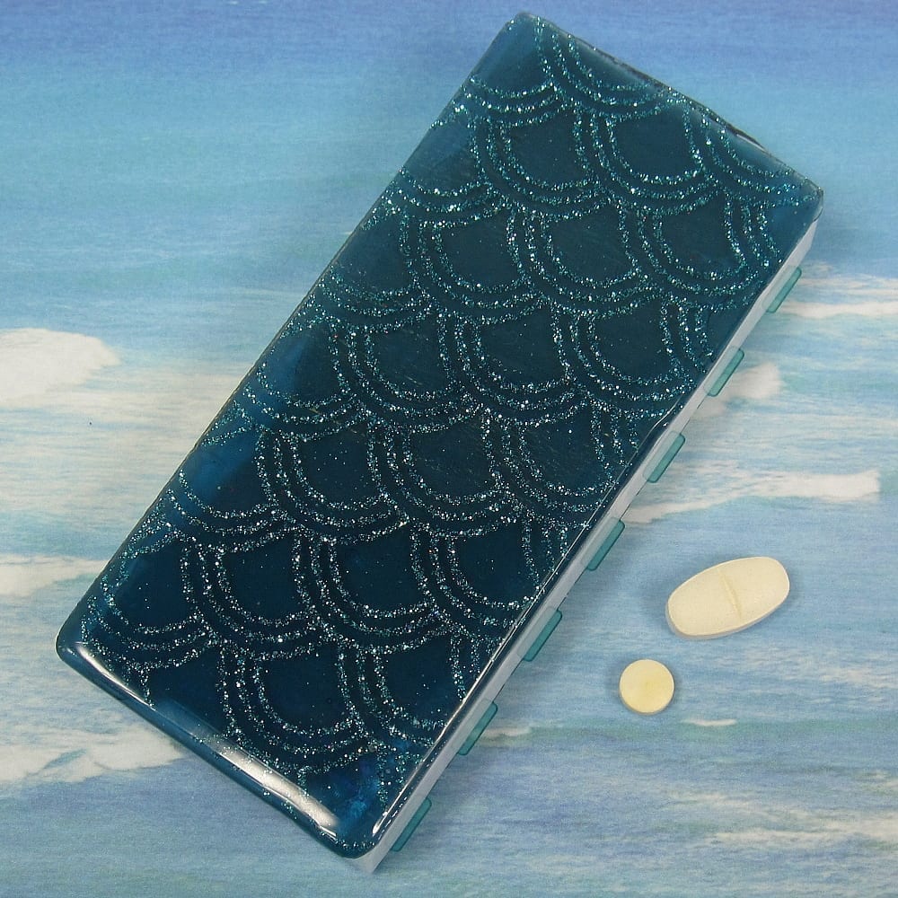 A glittery pattern of aqua arches floats in clear jewelry quality resin on the blue stained glass top of this medium 14-dose pillbox. Turn this pillbox over to access its two rows of 7 compartments, each with separate hinged lids labeled with letters for the days of the week. Compartments have curved bottoms so their contents can be easily dispensed. The base part of the box is solid white, but the lids are transparent aqua. Each compartment is .937 x .75 x .687 inch deep (inside measurements). Externally, the box measures 2.5 x 5.125 x approximately .625 inches high. This box could also be used for one week’s morning/evening doses, and with its slim profile, it would make an excellent pill case for travel..