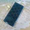 A glittery pattern of aqua arches floats in clear jewelry quality resin on the blue stained glass top of this medium 14-dose pillbox.