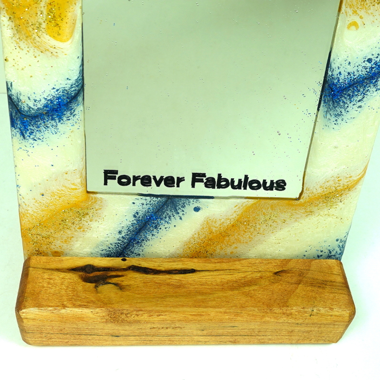 You’ll feel “Forever Fabulous” when you gaze into this unusual blue, gold, and cream fantasy enameled mirror. Complimentary colored glitter is strategically placed in the mirror’s colorful border. The glitter does not photograph well, but it makes this creation even more dazzling in hand and especially in sunlight. A durable clear resin layer protects the entire surface and the “Forever Fabulous” lettering.