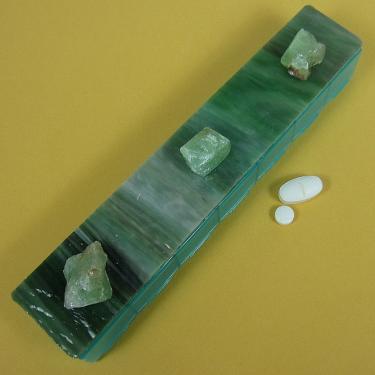 Three green Mexican rhombahedral calcite stones sit atop the shaded and textured green stained glass top of this large 7-dose strip decorative pillbox. The stones look like they are sitting in a green grotto’s watery pool. Turn the pill dispenser over to see its 7 compartments that have separate hinged lids labeled with letters and Braille for the days of the week. The base pill box color is transparent aqua. Each compartment is 1.375 x 1 x approximately 1 inch deep (inside measurements). Externally, the pill organizer measures 1.625 x 7.375 x approximately 1.5 inches high.