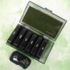 The durable, black, BPA-free plastic boxes, their hinges, and their UV-printed lettering are designed to withstand 10,000 uses. The translucent black plastic also protects light-sensitive medications. Each large compartment can hold 8 fish oil pills or 16 capsules. The approximate height of this box, including embellishments, is 2.25″. See the Size Guide for details.