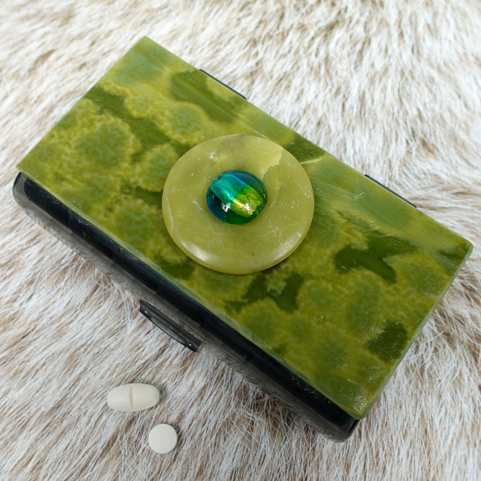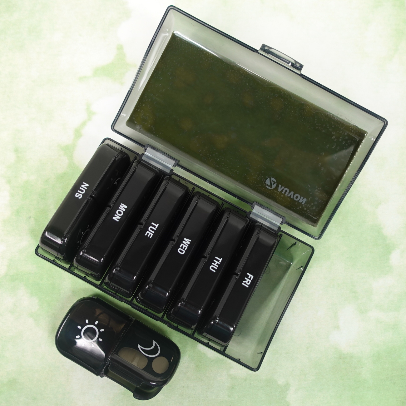 A green stone donut with a green and teal glass center masquerades as an olive on the matching mottled stained glass top of this 14-dose (weekly 2X daily) black pill pod box. Open the box’s hinged lid to access its seven individual pill pods, each labeled with the day of the week. Each pod has two separate hinged compartments with sun and moon lid graphics to designate morning and evening doses. You also could use this pill organizer for two weeks’ 1X-daily doses.