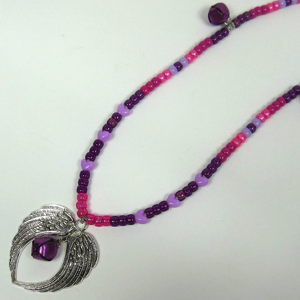 These purple and pink SteedBead rhythm beads for horses feature large purple jingle bells and big winged heart pendant