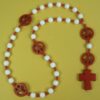 Red howlite peace symbol Cruciform beads, round white Week beads, red oblong spacer beads, and a red howlite cross grace this 16-inch set of Anglican Prayer Beads. They feel delightful in hand, and they will be a welcome companion for your prayers. This set features a resurrection/listening bead between the invitatory and first cruciform bead.