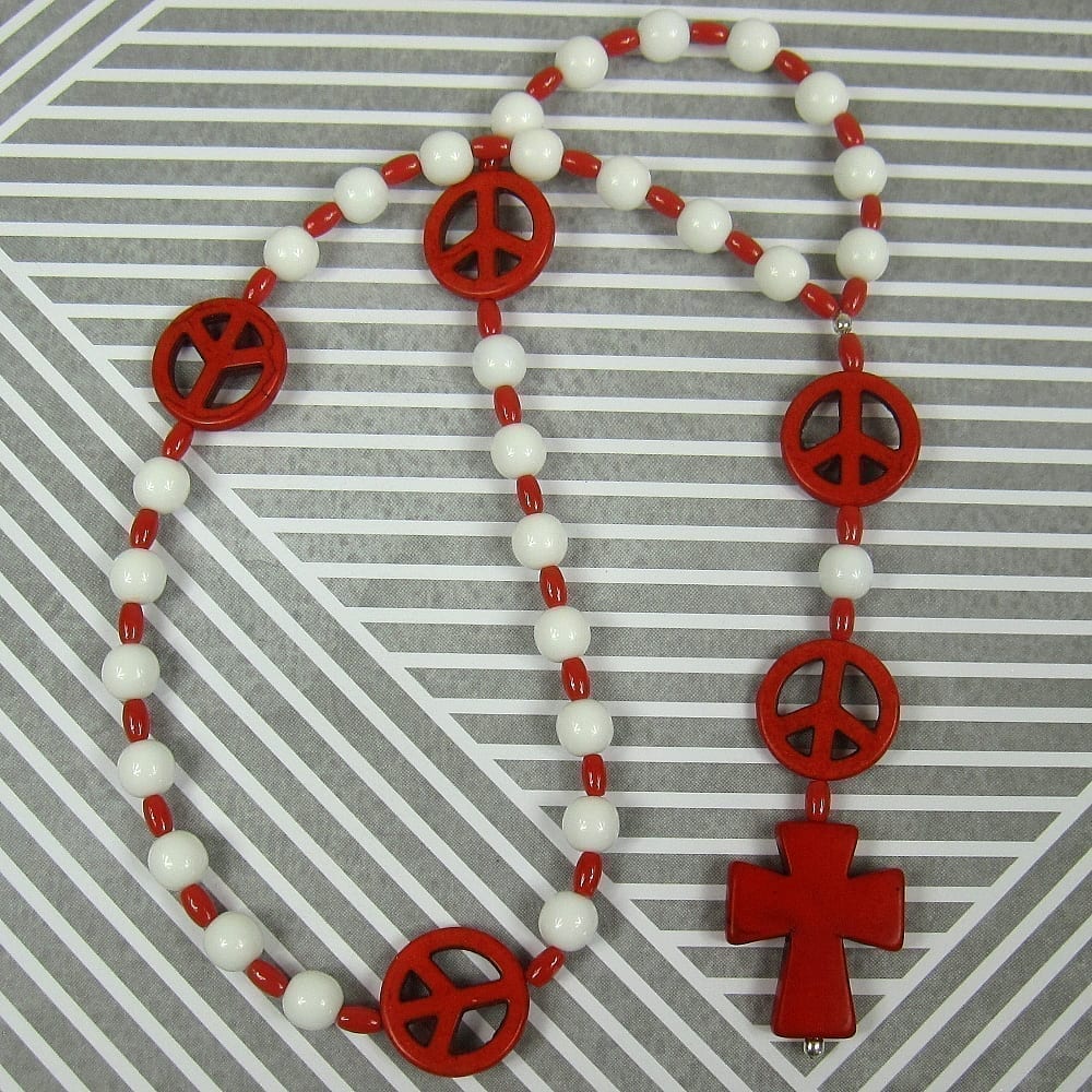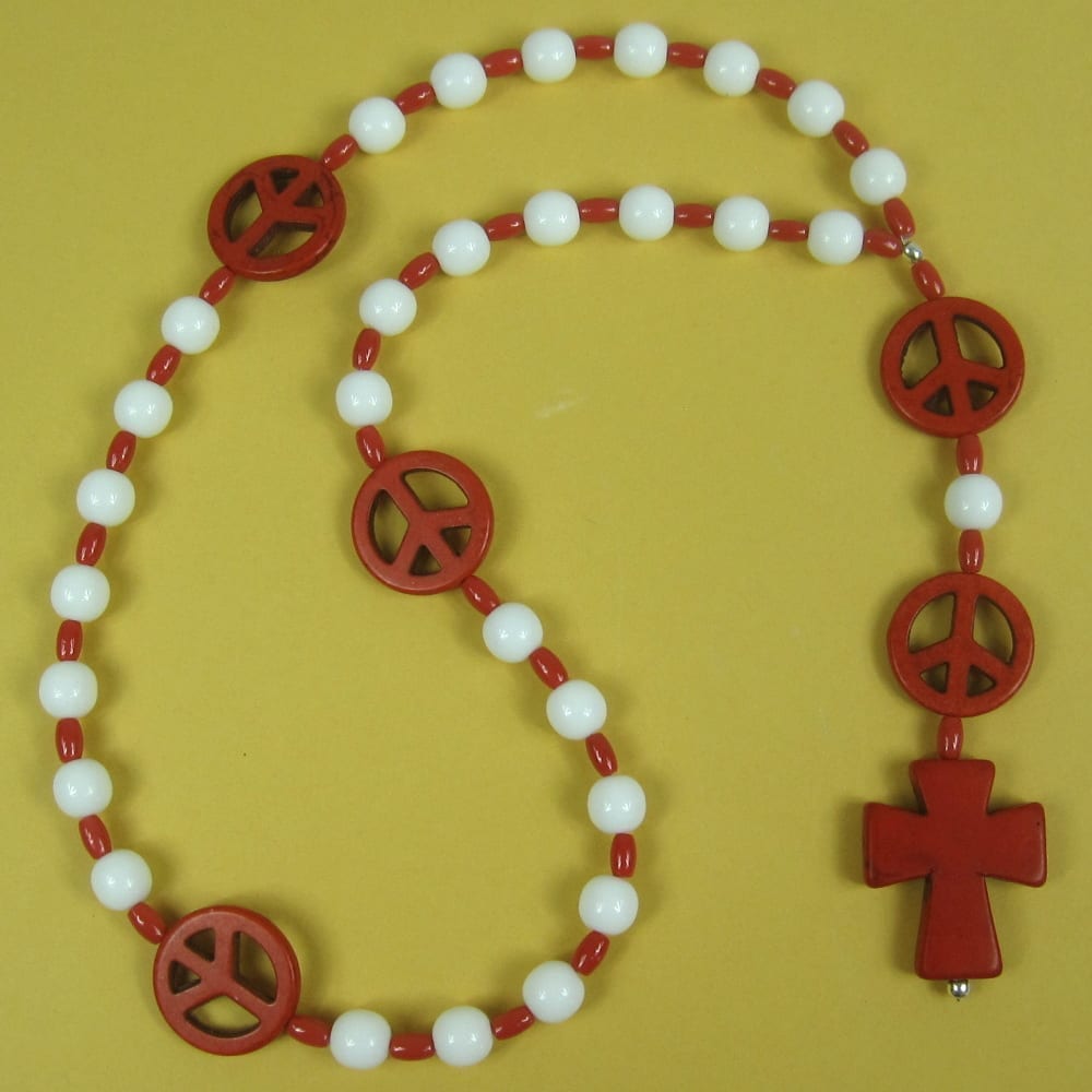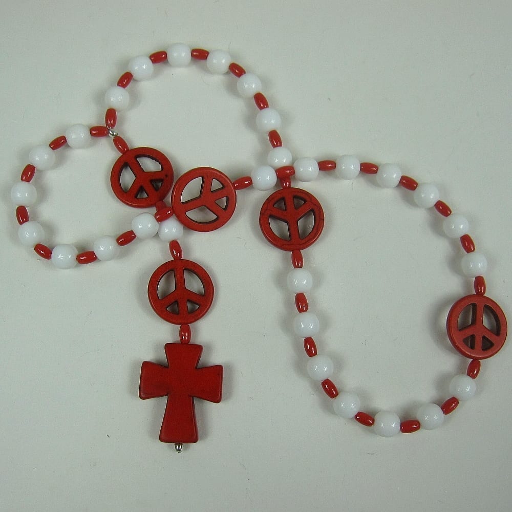 Red howlite peace symbol Cruciform beads, round white Week beads, red oblong spacer beads, and a red howlite cross grace this 16-inch set of Anglican Prayer Beads.